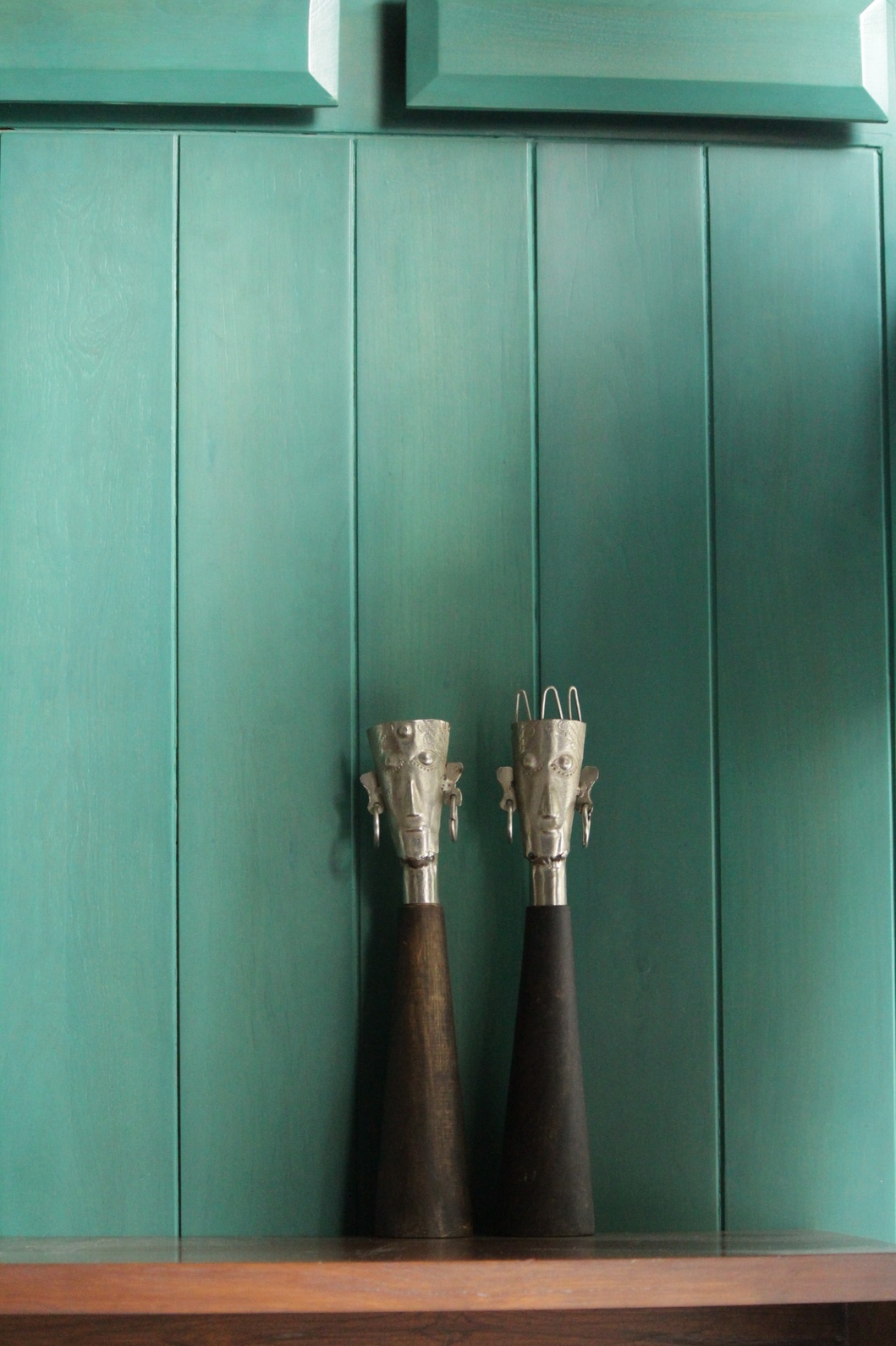 This unique set of handcrafted decorative dolls showcases a blend of tribal artistry and contemporary design. Each figure features an elongated, cone-shaped body adorned with textured metallic accents, creating a striking contrast against the dark, matte base. The dolls’ faces are sculpted with expressive, stylized features, highlighted by prominent earrings and distinctive headpieces that add character and cultural charm. Their tall, slender forms make them elegant statement pieces, perfect for displaying on shelves, consoles, or artistic corners. This set brings a touch of ethnic craftsmanship and timeless aesthetic appeal to any interior space.