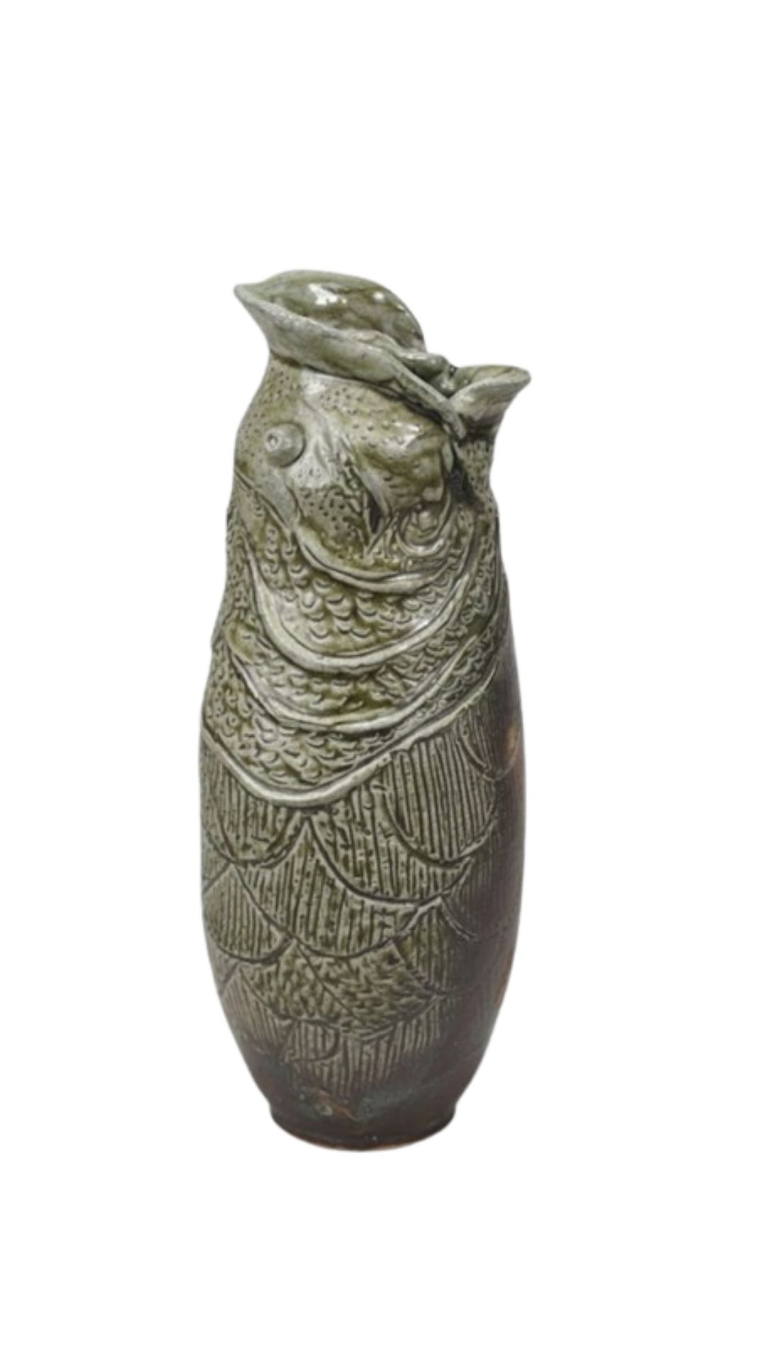 This elongated ceramic form evokes a mythical, fish-like presence shaped by water and imagination. Earthy reddish brown tones and wood-fired textures highlight its organic