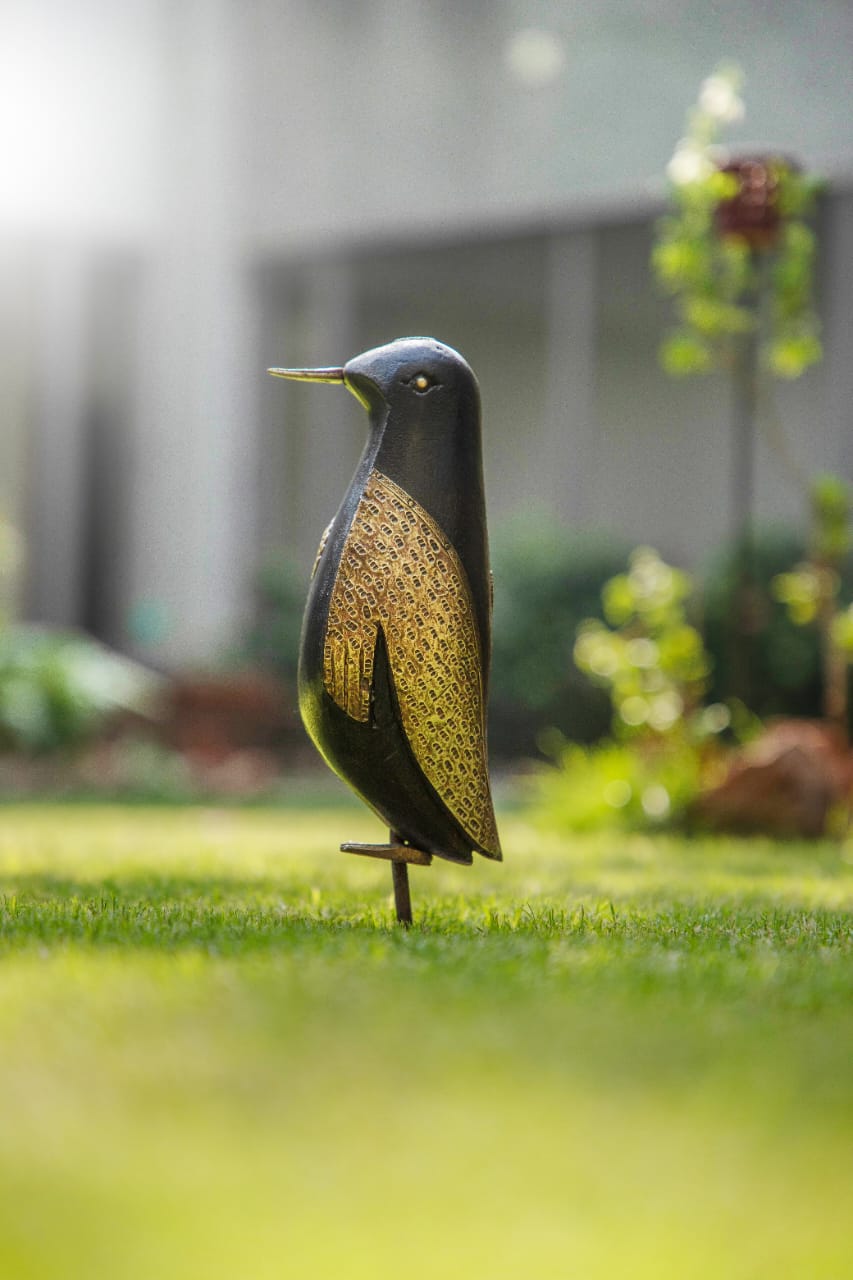 This charming wooden penguin sculpture stands elegantly atop a sturdy iron rod, making it a delightful decorative piece for both indoor and outdoor spaces. The penguin features a sleek, black-painted head and body, contrasted by a beautifully patterned golden section on its chest and wings. Its smooth, carved contours and minimalist details give it a modern yet handcrafted appeal. The iron stand elevates the figure slightly above the ground, creating a clean and balanced display. Perfect for adding a touch of whimsy and artistic flair to a garden, lawn, patio, or interior décor.