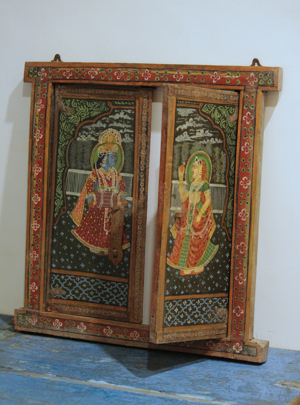 This beautifully handcrafted Radha Krishna door features intricate traditional artwork that captures the divine charm of the beloved deities. Each panel showcases a detailed hand-painted depiction—Radha on one side and Krishna on the other—adorned in vibrant colors and ornate patterns that reflect classic Indian folk artistry. The wooden frame is embellished with delicate floral motifs and decorative borders, adding depth and richness to the overall design. Perfect as a wall accent, temple door, or statement piece in a spiritual corner, this door brings a touch of devotion, culture, and timeless craftsmanship to any space.