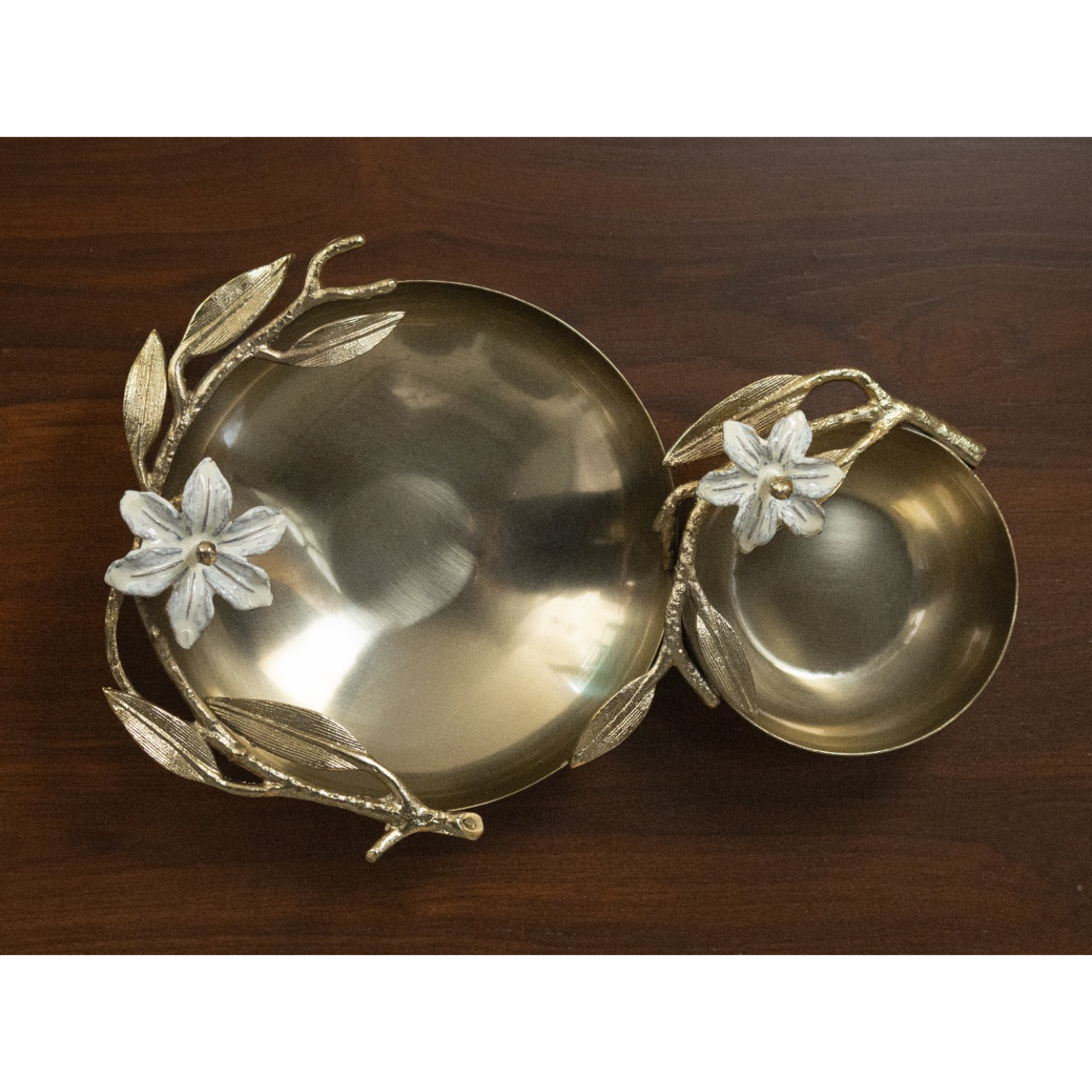 Beautiful chip dip platter in the gold brass collection is a stunning piece to add to your serveware collection.The delicate enamel flower motifs that truly elevate these platters to a work of art. Each motif is meticulously crafted with precision and care, infusing the design with a sense of whimsy and charm. The vibrant colors and intricate details of the flowers add a touch of natural beauty to the platters, creating a striking contrast against the rich golden backdrop.