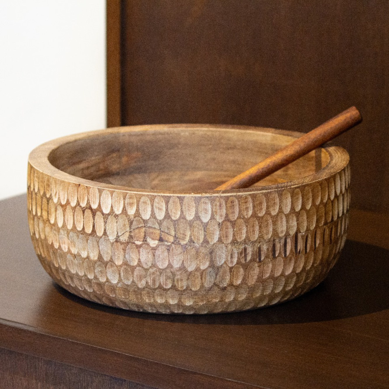 Bring a touch of rustic elegance to your home with this beautifully handcrafted Wooden Bowl. Designed with a classic round form, the bowl features a textured pattern on the exterior, giving it a warm, artisanal charm. Its natural wooden finish highlights organic grain variations, making each piece uniquely appealing.
