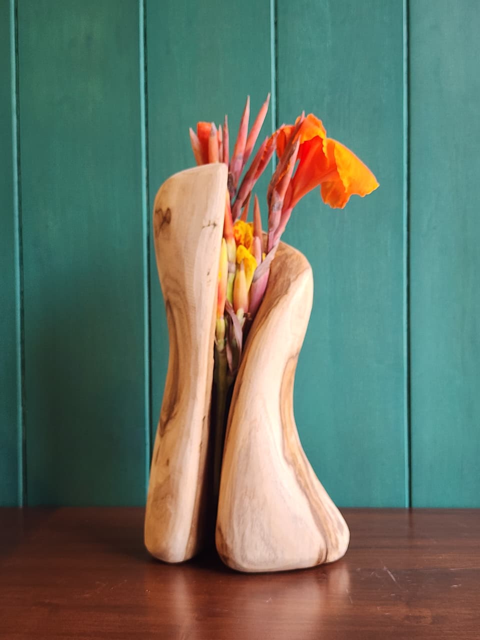 A hand-carved wooden sculpture. The fluid, earthy grain of the vessel creates a stunning contrast against the deep teal backdrop—a perfect fusion of raw texture and botanical grace.